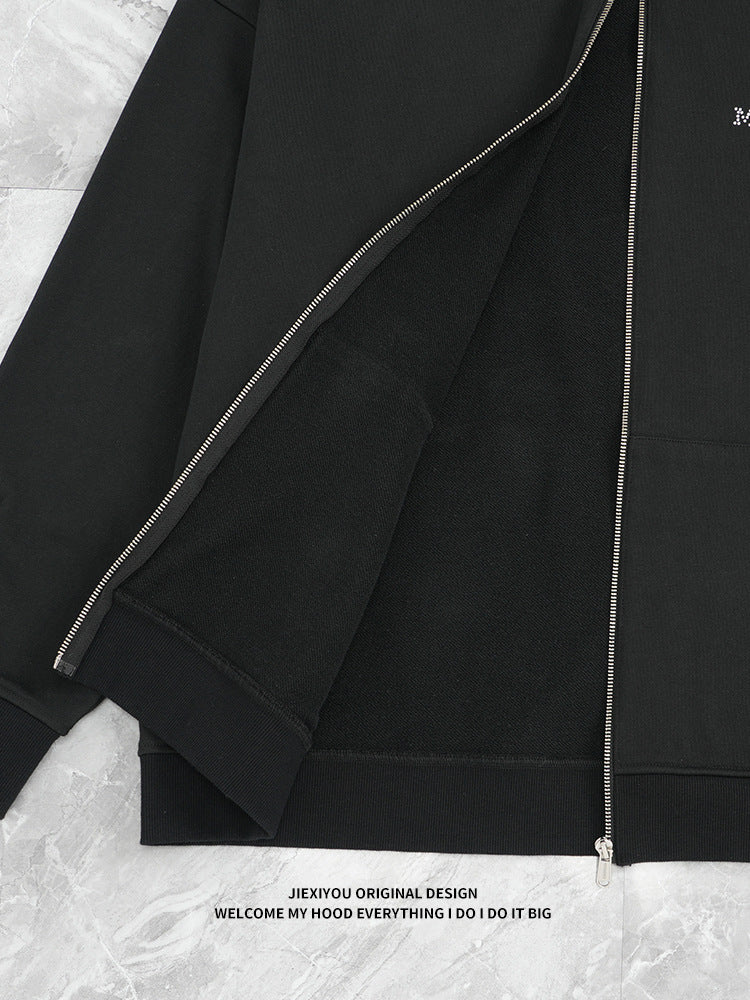 This men's heavyweight zip hoodie features bold rhinestone detailing on a relaxed streetwear silhouette. Crafted from premium cotton fleece, it combines athletic functionality with urban style for versatile spring layering.