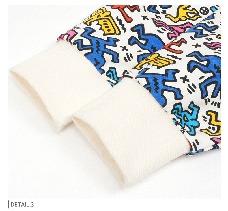 This vibrant hoodie features all-over colorful graffiti prints with character graphics on crisp white cotton fabric. The bold artistic design and oversized fit create an energetic urban statement for contemporary street style.